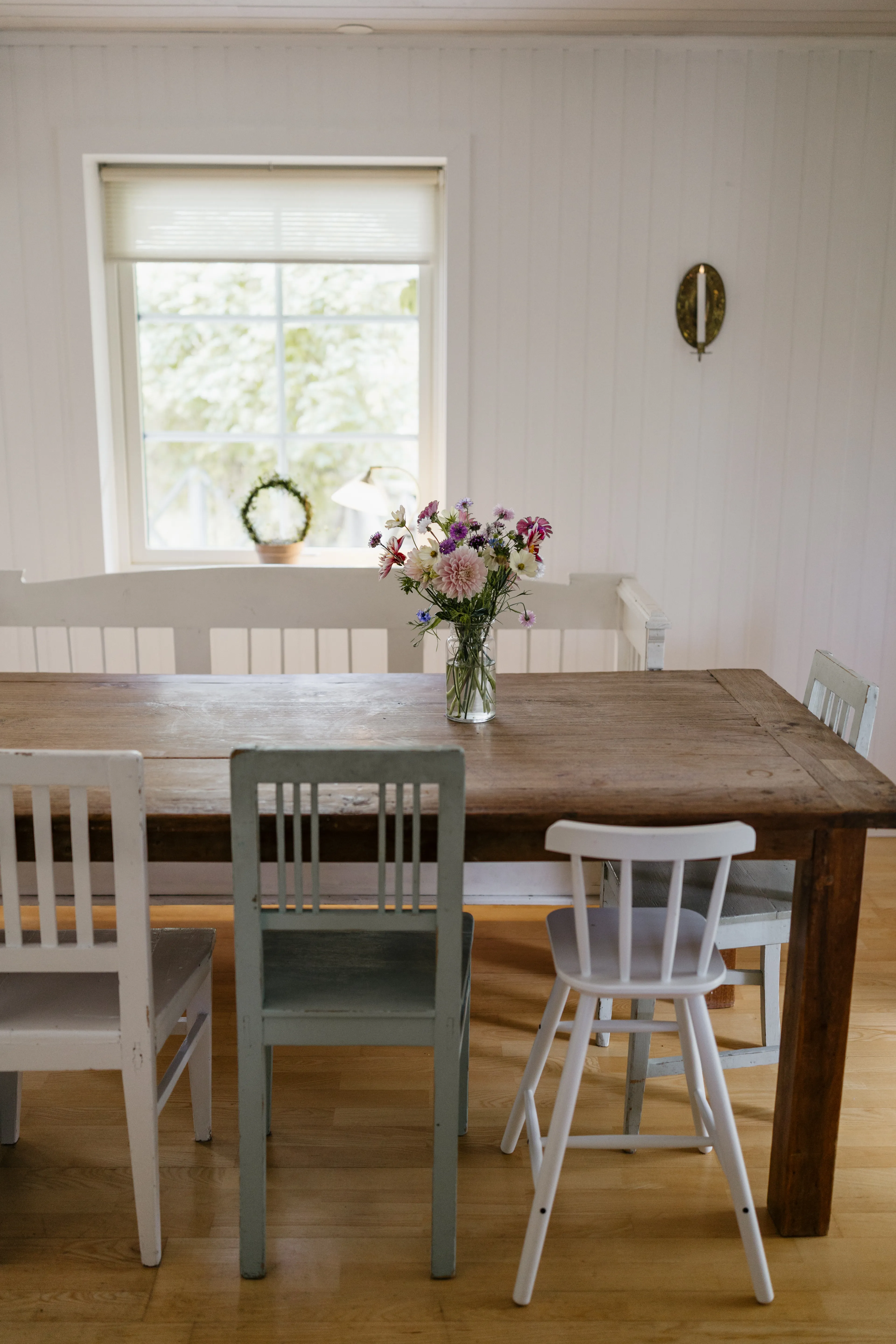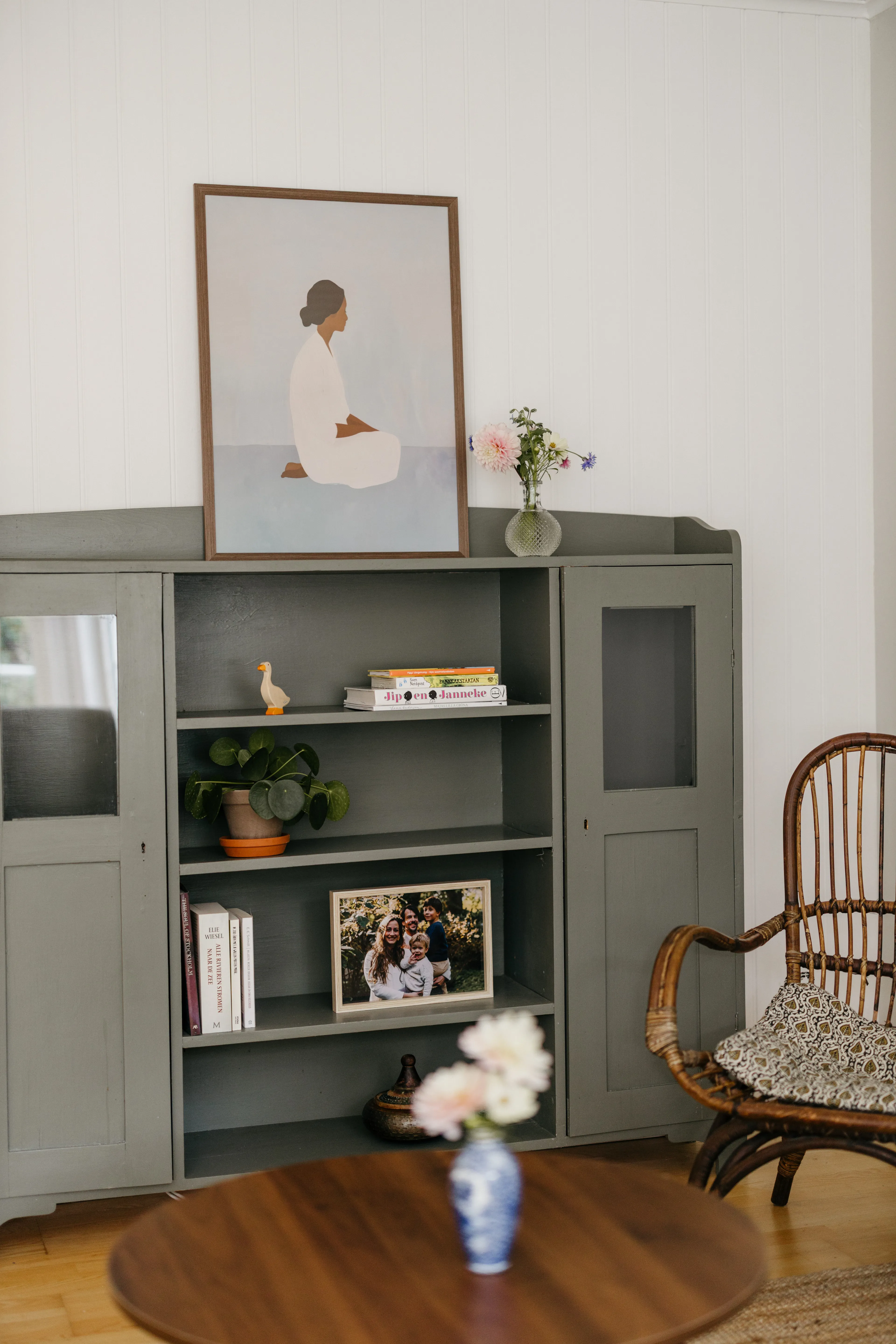 Alle meubels kwamen mee vanuit Nederland. “Het is duur en onzin om alles opnieuw te kopen. De Zweedse eetkamerbank hadden we al jaren, die komt hier goed tot z’n recht.” De vorige bewoners lieten in de kas een groen vintage kastje achter, dat nu hun woonkamer siert. “Oude spullen hebben veel meer karakter. Als ik langs een loppis (kringloopwinkel, red.) rijd, moet ik altijd even kijken. Het is een sport om tweedehands schatten te vinden. Een kaarsenstandaard met een meisje dat twee kaarsen vasthoudt, zou ik in Nederland nooit kopen. Hier past het, zonder dat het truttig wordt.” Binnenkort opent ze haar eigen loppis in de schuur voor in de tuin. “Vlag uit, QR-code en een potje voor losgeld erbij, heel Zweeds.”