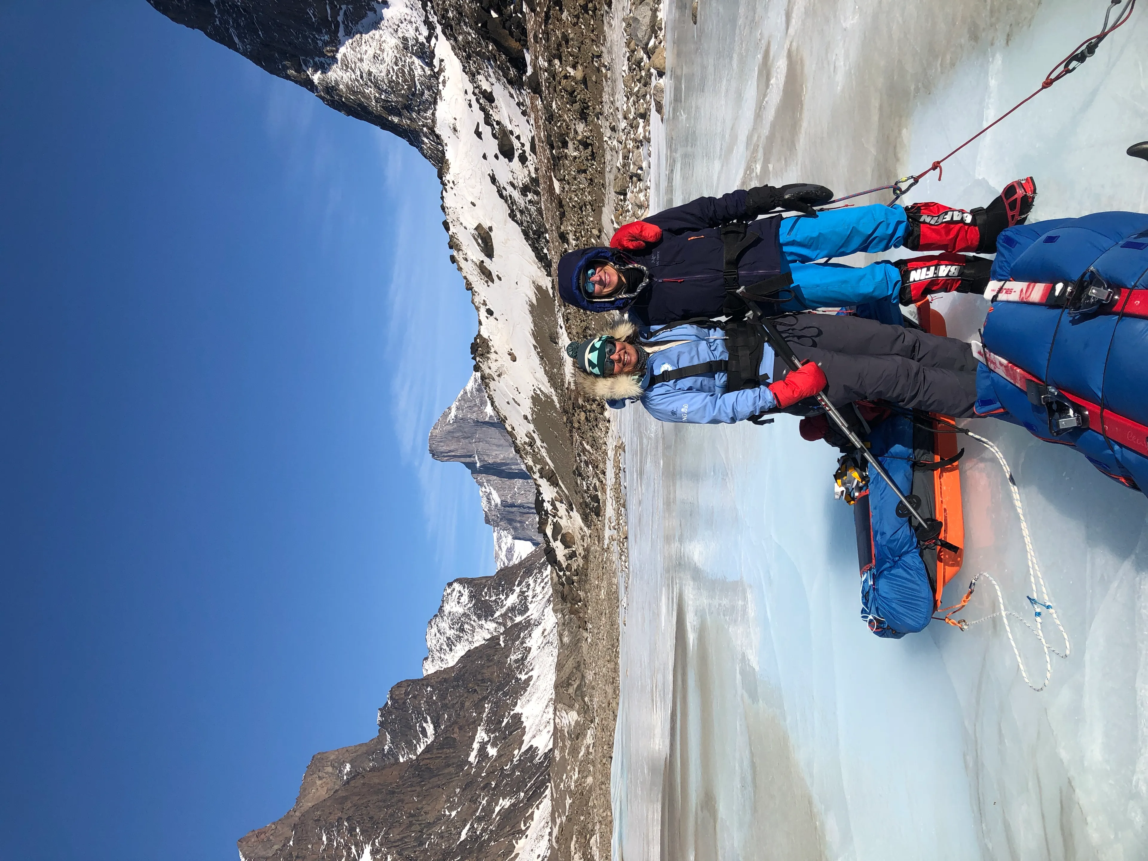 We maken maar langzaam voortgang. Ondanks het mooie weer hebben we te maken met lokale katabatische winden. Dat zijn valwinden die van de Penny-ijskap naar de Arctische Oceaan waaien. In rap tempo versnelt dit naar een storm met windstoten van 90 kilometer per uur, waardoor de gevoelstemperatuur negatief verdubbelt. Er valt niet tegenop te skiën, er is constante bezorgdheid voor bevriezingen en na een paar uur kun je jezelf niet meer warm krijgen. Onze enige hoop is dat als we eenmaal over de Akshayuk-pas zijn, we de wind in onze rug zullen krijgen. De vallei is kaal geblazen door de wind, alle sneeuw is weg. We klungelen nog wat door met onze ski’s en slee, maar we glijden voortdurend uit of de slee trekt ons omver. In de namiddag zien we eindelijk de iconische vierkante berg Asgard torenhoog boven de Turner-gletsjer uitsteken. De berg heeft een enorme aantrekkingskracht en als we de tent hebben opgezet aan de voet van de Turner-gletsjer, klimmen we naar boven om een beter uitzicht te krijgen. Een bijtende wind waait vanaf de ijskap en door het diffuse zonlicht krijgen de dansende kristallen de kleuren van de regenboog. Norma zucht: “Dit is onwerkelijk.”