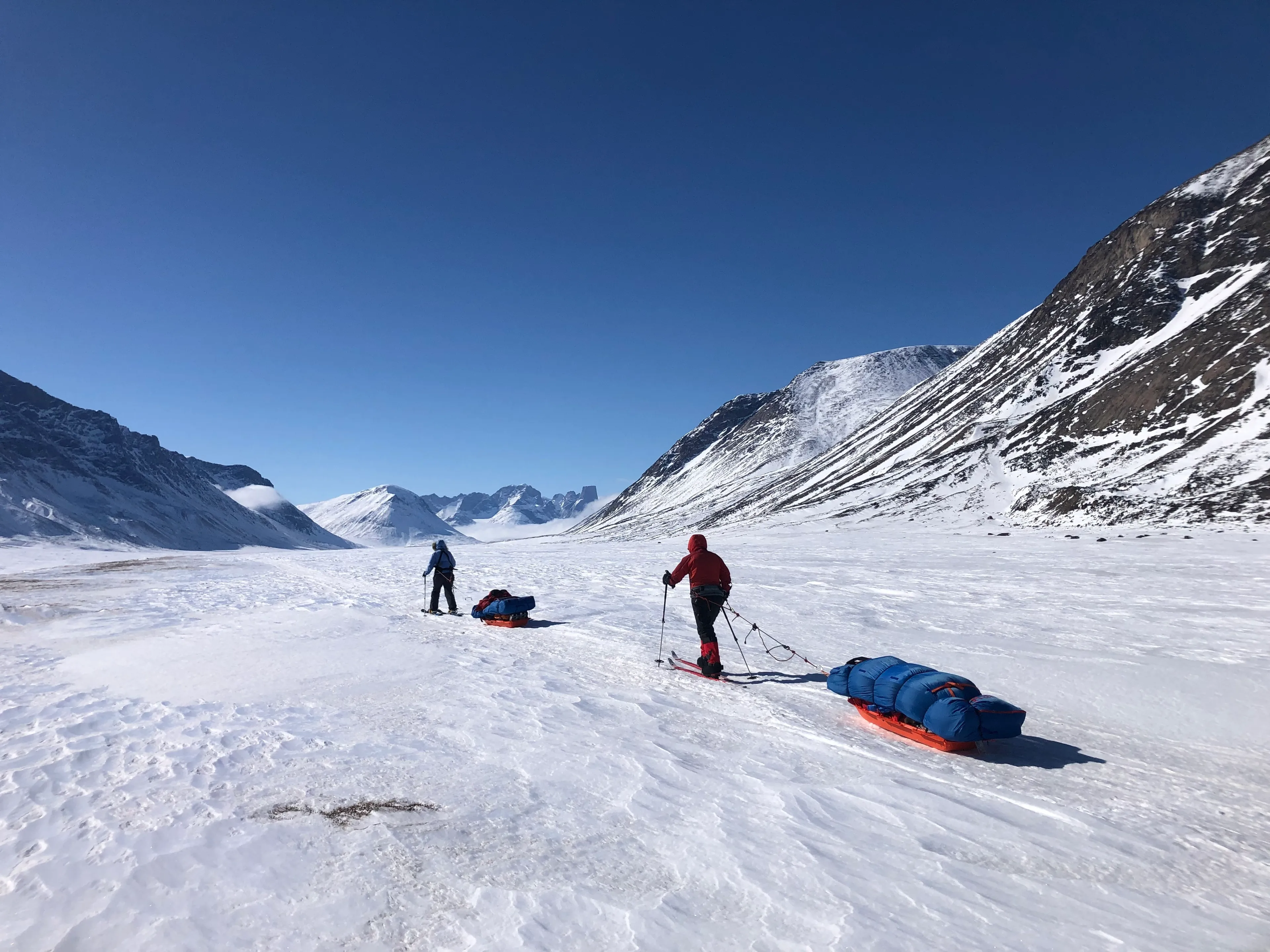 De Owl Valley, vernoemd naar de sneeuwuil die hier voorkomt, is vlak en minstens vijf kilometer breed. De toendra is bedekt met een flinterdun laagje harde sneeuw waar je makkelijk doorheen breekt. Het landschap is schraal en gladgeschuurd door de massieve gletsjers van de Penny-ijskap. We voelen ons nietig en bevoorrecht, al moeten we wennen aan de schaalgrootte van dit landschap. Niets is minuscuul, alles bombastisch en overweldigend. In het begin glijden de sledes moeiteloos achter ons aan, maar als het terrein grilliger en steiler wordt, kost het moeite om het gewicht van de slee over de rotsblokken te trekken. De eerste dagen moeten we ook enorm wennen aan ons ritme; in de kou kost alles veel meer tijd en energie. Regelmatig moeten we stoppen om onze vingers op te warmen en een tent opzetten kan zomaar een paar uur in beslag nemen. We houden iedere paar uur een korte pauze om wat te drinken en wat energierepen, noten en gedroogd fruit te snacken.