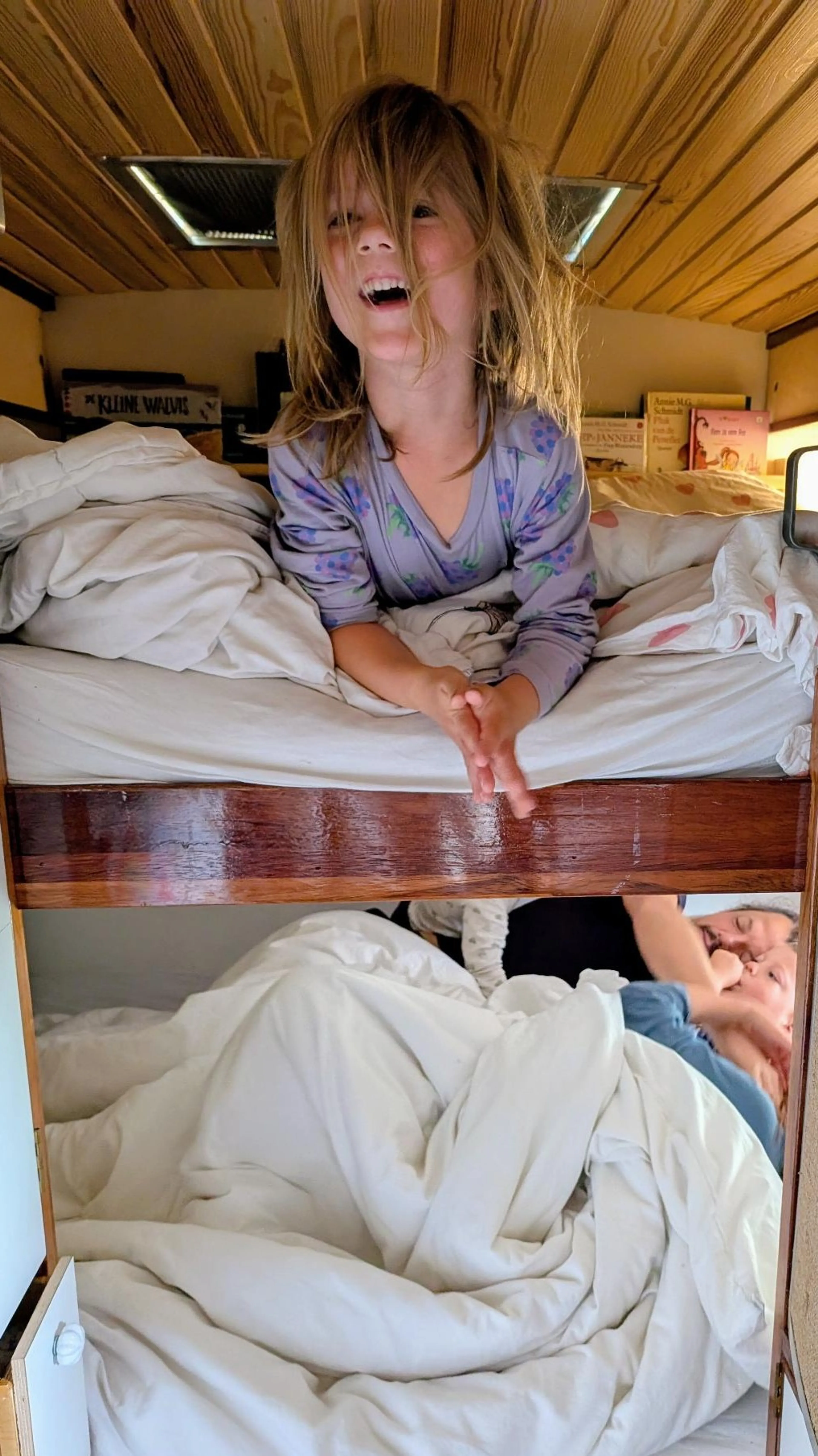 De overgang van een ruim huis met veel spullen naar een kleine ruimte met ieder een kratje aan eigen dingen. Blauwe plekken op ons hoofd en benen omdat we ons overal aan stoten.’s Nachts even snel plassen betekent nu over de ander heen klimmen, om vervolgens als een buikdansende slang van het bed te glijden. Of een van ons mag middenin de nacht, gewapend met koplamp en elektrische vliegenvanger, op muggenjacht. Denk je eindelijk te kunnen slapen, wordt er een kind wakker van de jeuk. Daardoor wordt de volgende wakker. En de volgende. En de volgende. Regelmatig eindigen we met vieren in een bed van nog geen anderhalve meter. Pas werd ik in in paniek wakker omdat ik droomde dat ik vastzat in een kleine ruimte en ik nergens een uitgang zag.