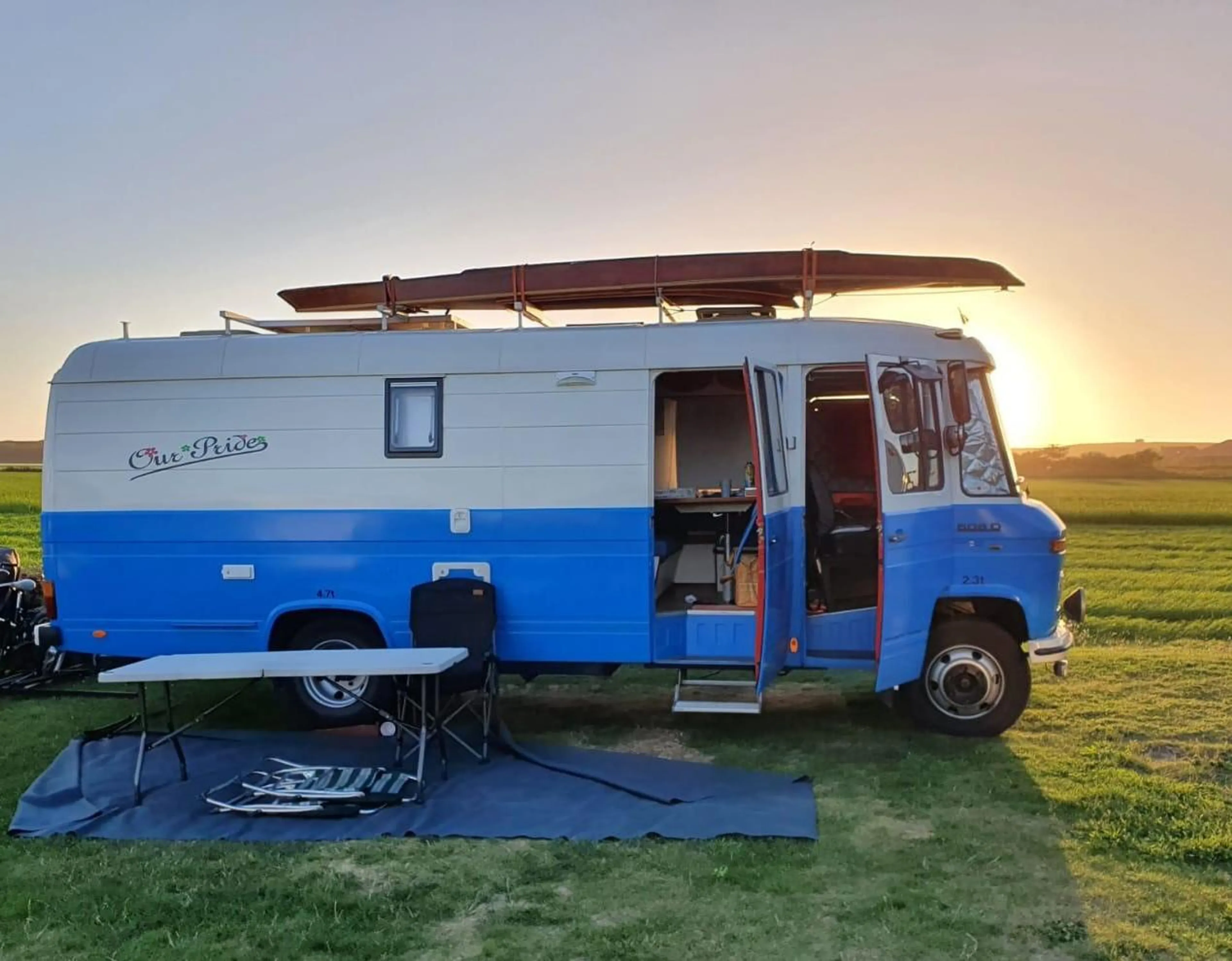 Dat bleek allesbehalve. De eigenaar, Herman, is een echte liefhebber en heeft de bus zelf omgebouwd. Een voormalige EHBO wagen uit Duitsland, een 608 widebody van zeven meter lang, met vijf vaste bedden.
