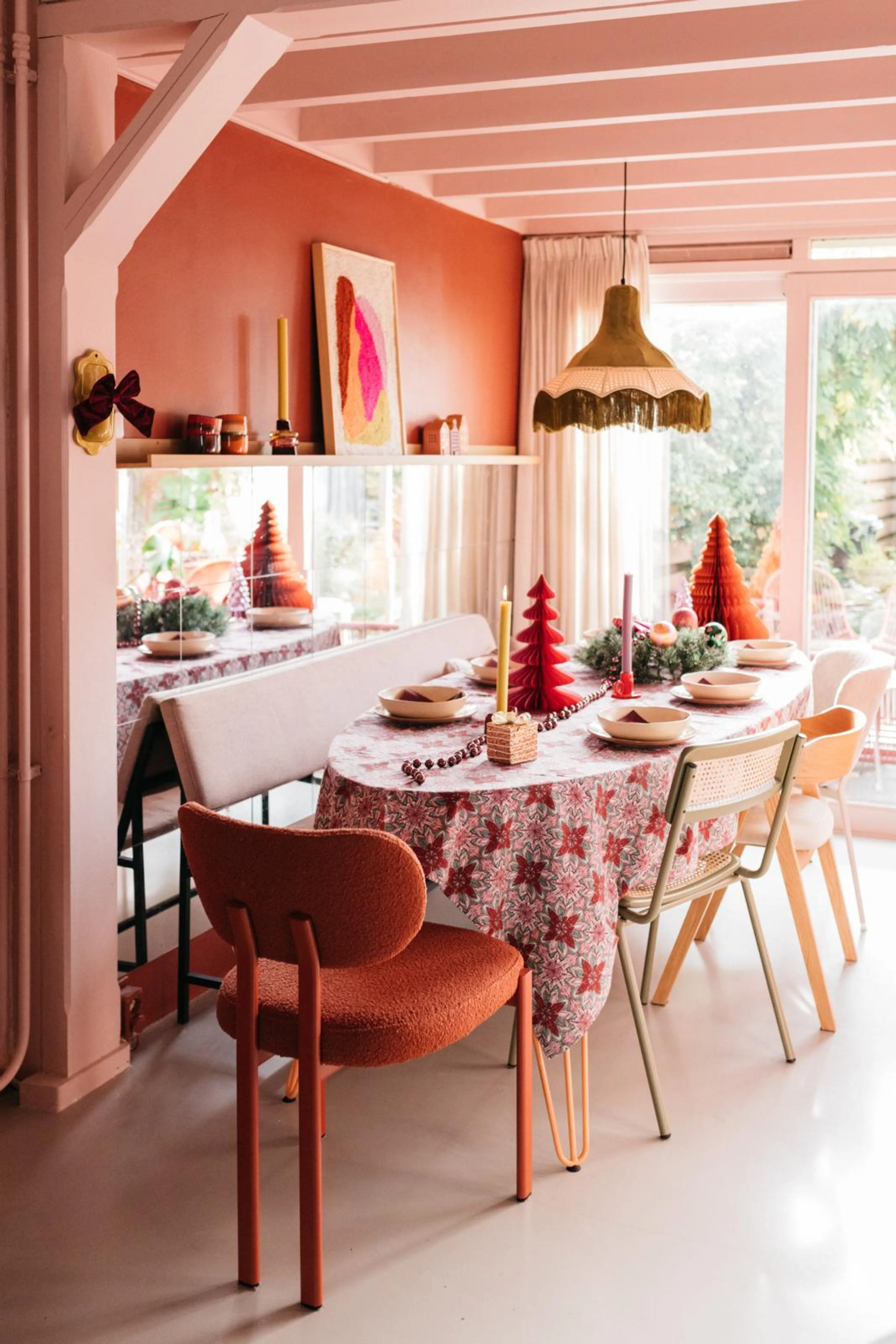 Het gezin woont sinds 2011 in dit huis. Toen ze er kwamen wonen, was alles nog wit. Inmiddels heeft elke kamer een eigen kleur. En dat kan zomaar weer veranderen, vertelt Gerdien. “Ons huis heeft inmiddels alle kleuren gehad. Ik verander vaak. Het palet dat er nu is, hoeft er over een tijdje niet meer te zijn. Vriendinnetjes van onze dochters zeggen vaak: ‘Wat mooi dat er zo veel kleur is.’ Aan mensen die ook van kleur houden, geef ik altijd de tip: als je kleur wilt gebruiken, doe het gewoon. Maar zorg er wel voor dat de tinten terugkomen in je interieur, anders wordt het rommelig. Ik haal vaak staaltjes bij de bouwmarkt, houd die tegen de muur en kijk of ze bij de andere kleuren passen. Daarna laat ik die kleur terugkomen in accessoires zoals kussens of een vloerkleed. Bij mij gaat dat vanzelf. Of ik vind gewoon snel dat iets kan, haha.”
