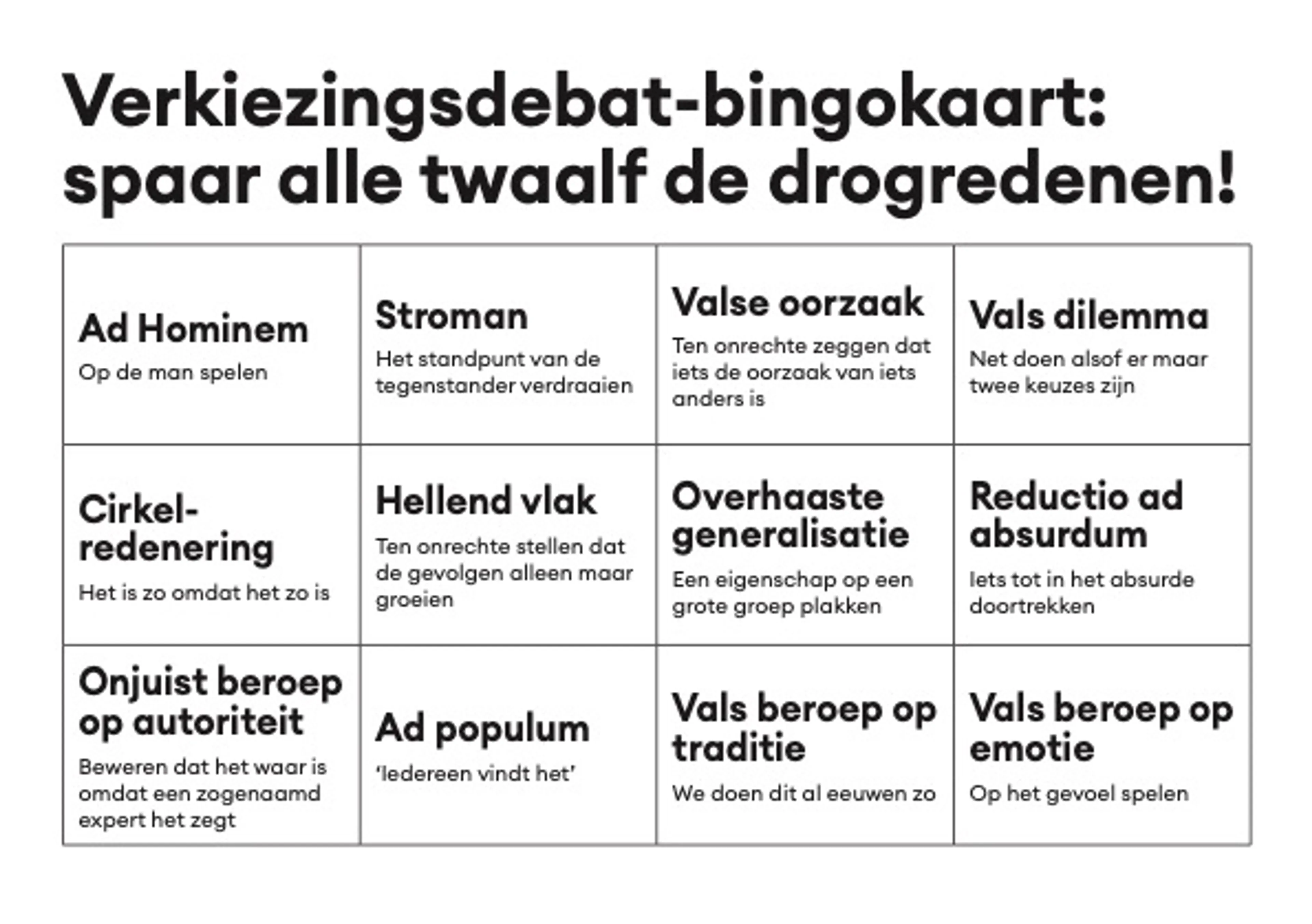 En dan kom je bij de drogredenen: argumentaties die logisch klinken, maar het niet zijn. Binnen het debatteren kennen ze er een heleboel, maar er zijn twaalf echte klassiekers. En om jou te helpen bij het kijken, zetten wij ze op een rijtje, met een handige bingokaart om erbij te houden tijdens de debatten.